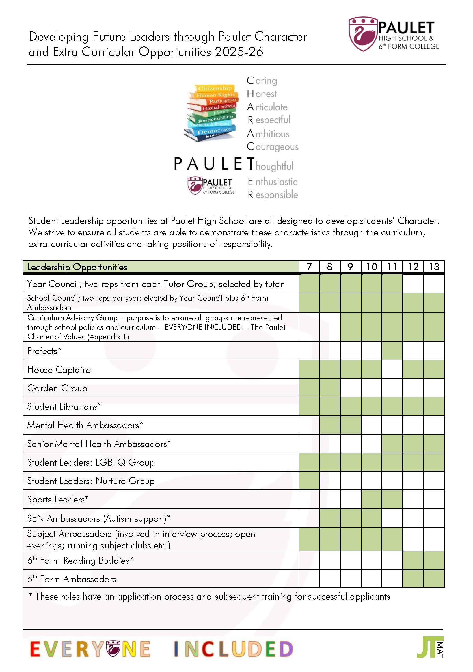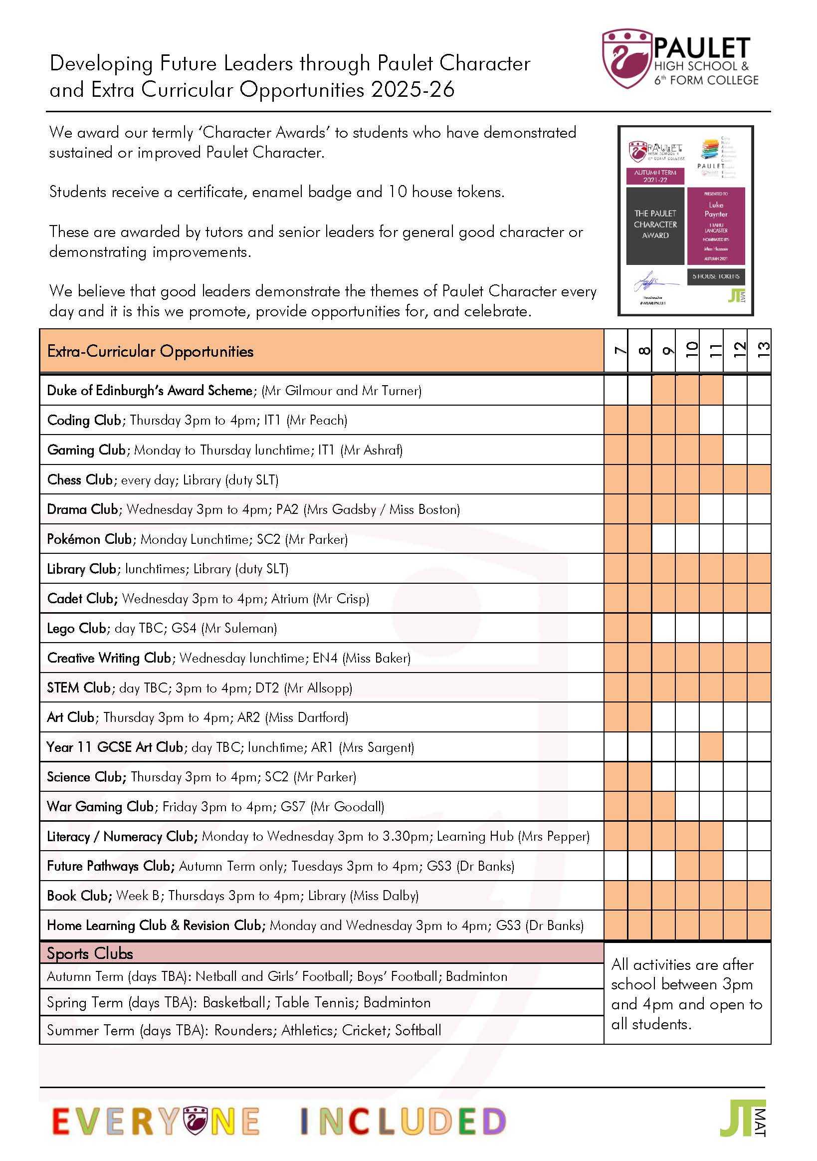 - Wellbeing Champions, a six week course open only to year 7 aimed at those finding the move to secondary school or making new friends difficult.